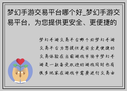 梦幻手游交易平台哪个好_梦幻手游交易平台,为您提供更安全、更便捷的交易体验。在当前游戏市场中,梦幻手游是一款备受欢迎的游戏,同时也有很多玩家在游戏中需要进行交易。由于交易过程中存在很多风险,因此选择一个安全、可靠的交易平台显得尤为重要。本文将从六个方面为您详细介绍梦幻手游交易平台哪个好,为您提供更安全、更便捷的交易体验。