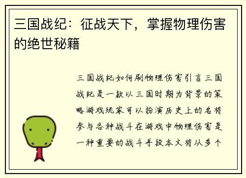 刷物理伤害是三国战纪中重要的战斗手段之一,通过选择合适的武将、培养武将、提升战斗力、刷副本和挑战、合理运用技能和增加队伍的战斗力等多个方面的努力,可以有效提高物理伤害输出。希望本文的介绍对玩家在三国战纪中刷物理伤害有所帮助。